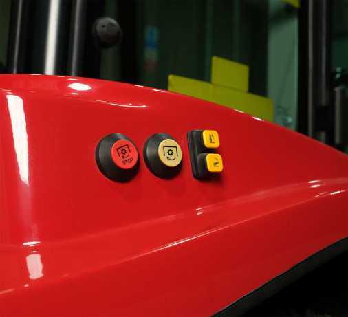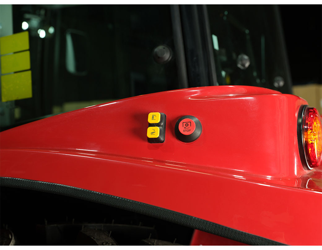 Botones de control hidráulico y toma de fuerza ubicados en el guardabarros derecho e izquierdo.